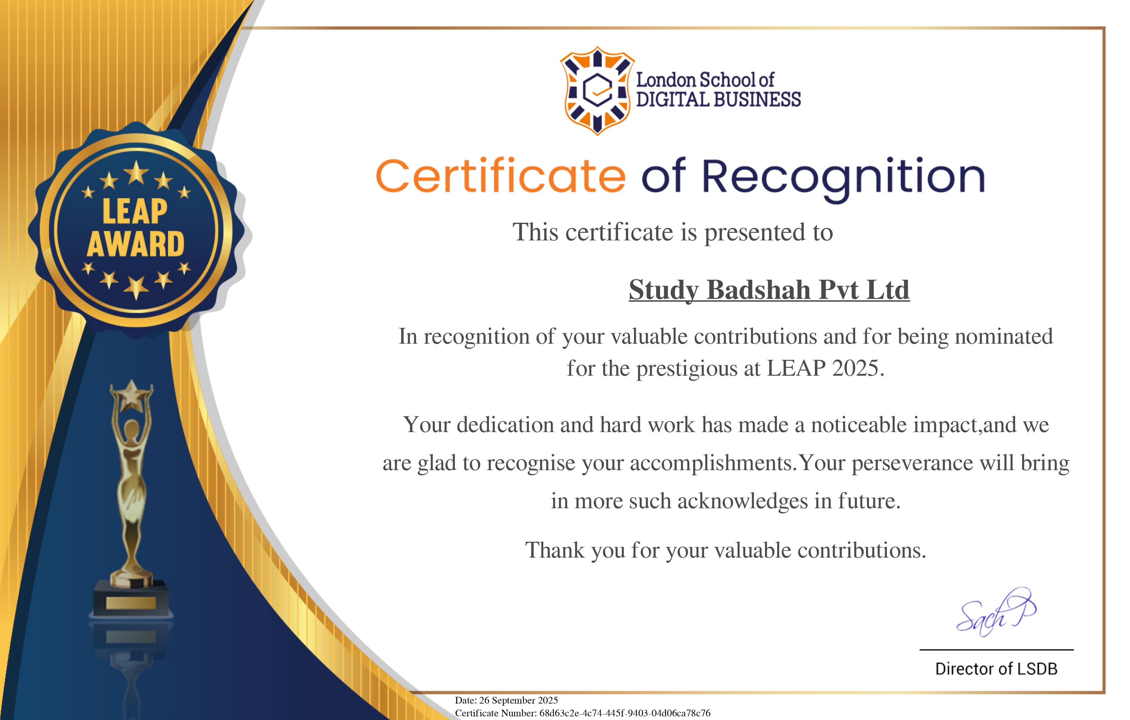 Study Badshah Pvt. Ltd. has been proudly recognized by the London School of Digital Business (LSDB) with a Certificate of Recognition for its valuable contributions and nomination at the prestigious LEAP 2025 Awards. This honor acknowledges our dedication, innovation, and impact in the field of digital education and professional training. It highlights our continuous efforts to deliver world-class learning experiences and empower learners with skills that matter in today’s evolving global economy. Being recognized by LSDB affirms our commitment to excellence and perseverance in making quality education accessible and impactful. Such acknowledgements motivate us to keep raising the bar, fostering collaborations, and driving forward our mission of creating meaningful learning opportunities for students across India and beyond. This recognition further strengthens our resolve to continue contributing to the global education ecosystem with dedication, innovation, and integrity.